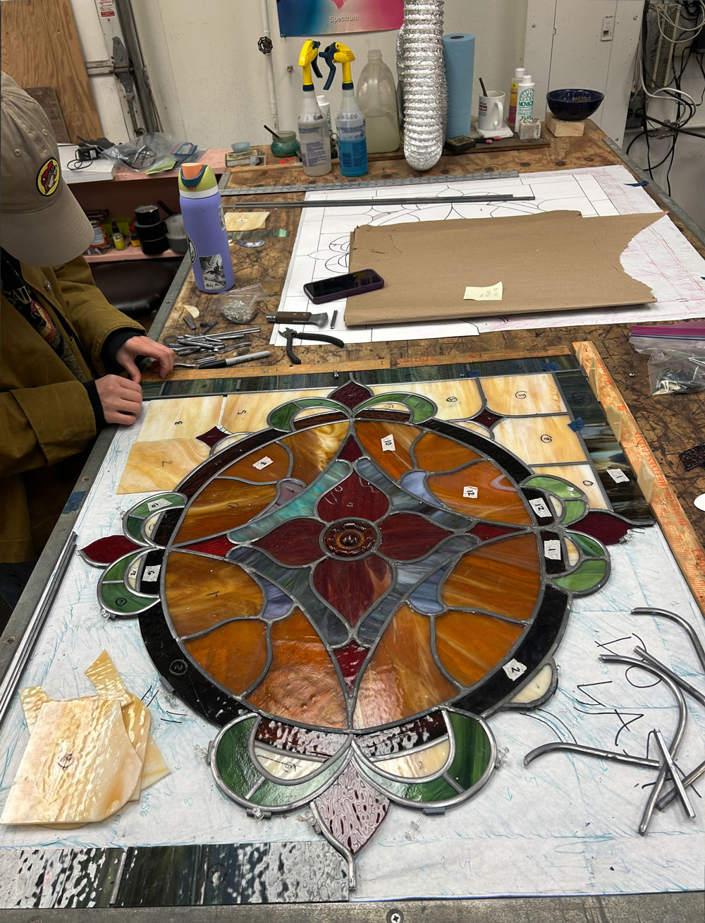 Here we are hard at work on another historical stained glass rebuild. From windows, to doors, to decorative glass panels, we can help restore any window to its full glory.